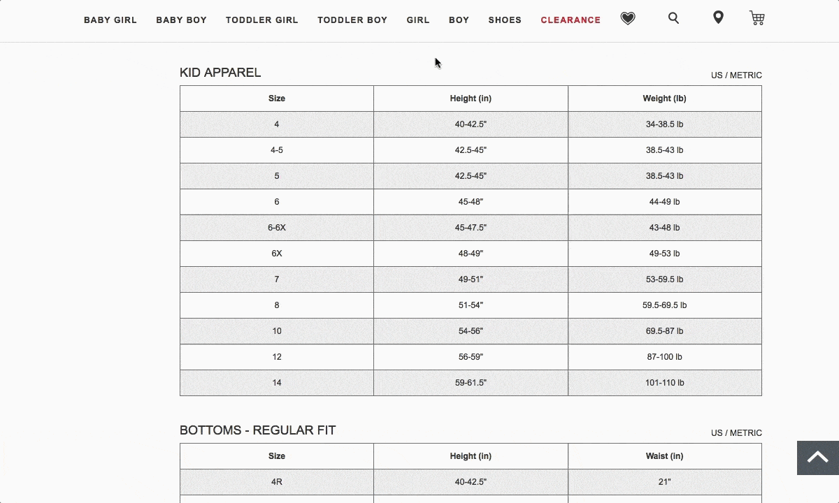 Чтобы не ошибиться с размером, рекомендуем измерить рост, обхват талии и вес ребёнка. Соотнесите их с размерами одежды Carter’s при помощи специальной таблицы: