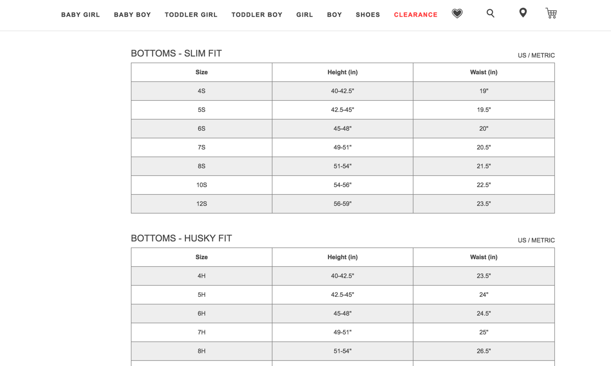 Например, у шестилетнего мальчика рост 115 см, обхват талии 50 см, вес 21 кг. Согласно таблице Carter’s по росту и весу ему подходит размер 6. Если при том же росте ребёнок весит меньше, чем полагается по таблице, то ему подойдёт ушитая одежда — Slim. Определите размер одежды по таблице Slim fit, которая расположена ниже основной: