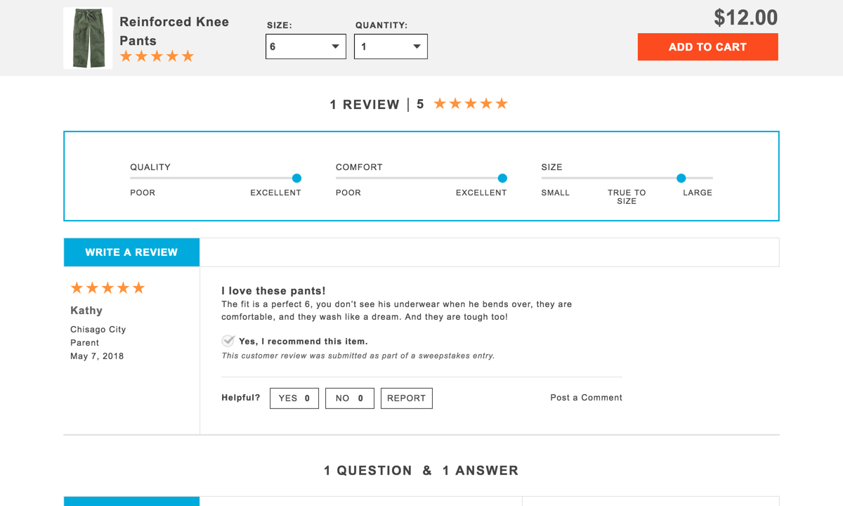 Покупатели Carter’s любят оставлять отзывы и нередко прикладывают фотографии одежды в жизни. А ещё для каждой вещи показаны оценка её качества, удобства и того, насколько она точно попадает в заявленный размер. Например, если покупатели говорят, что брюки маломерят, то имеет смысл взять их на размер больше.