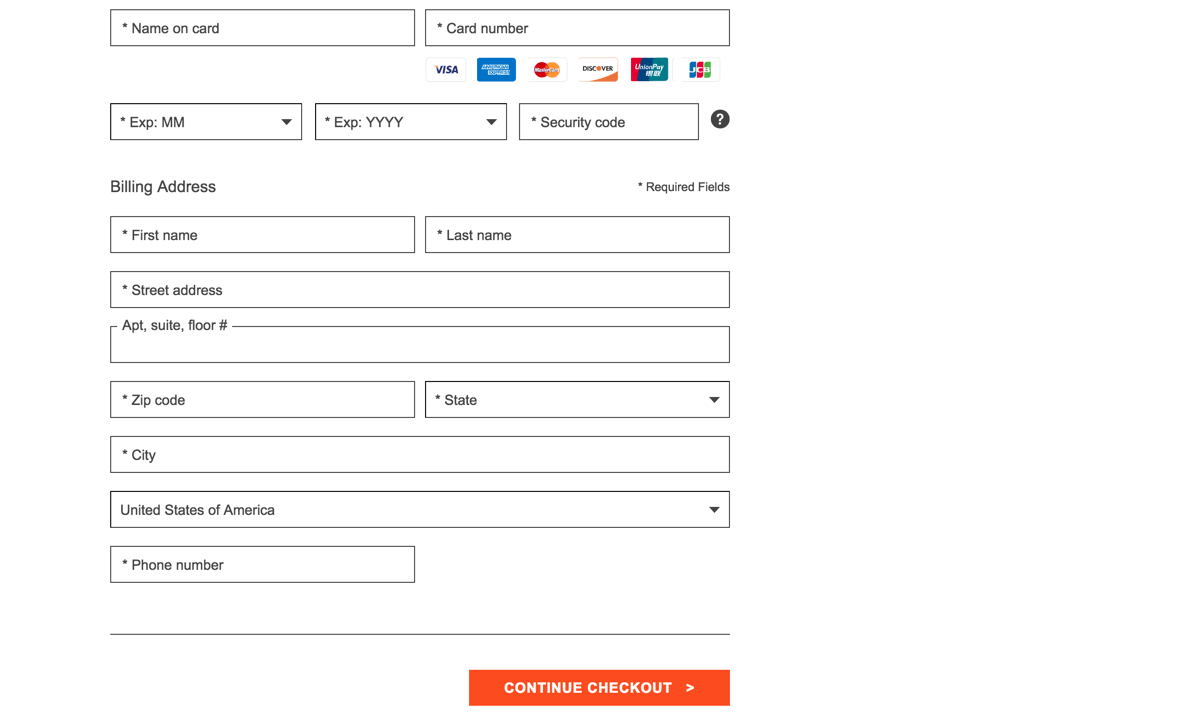 После того, как вы указали адрес и определились со способом доставки, переходите к оплате — нажмите оранжевую кнопку Continue checkout.