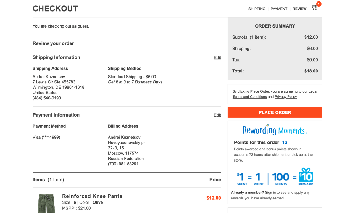 На открывшейся странице ещё раз проверьте, всё ли правильно. Если да, нажмите оранжевую кнопку Place order. Carter’s возьмёт ваш заказ в работу, и деньги за покупку спишутся с вашей карты.