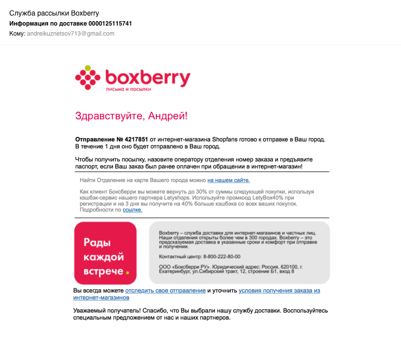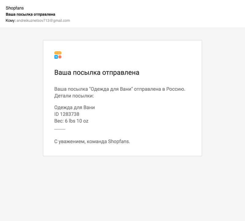 Как только посылка отправится в Россию, мы сообщим вам об этом по электронной почте: