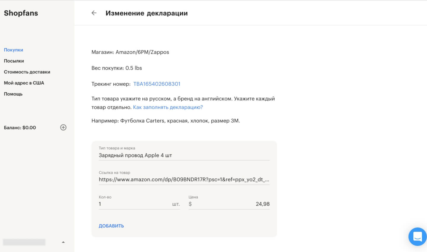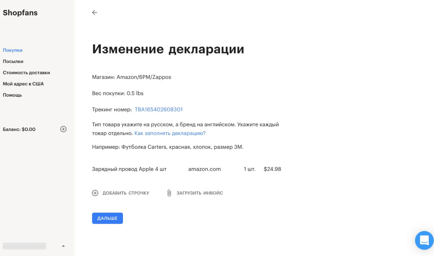 Заходите в раздел Покупки и заполняйте декларацию. Нужно указать тип товара, марку, ссылку на товар, количество и цену. Трекинг номер вам пришлёт магазин в письме с подтверждением покупки или отправки товара к нам на склад.