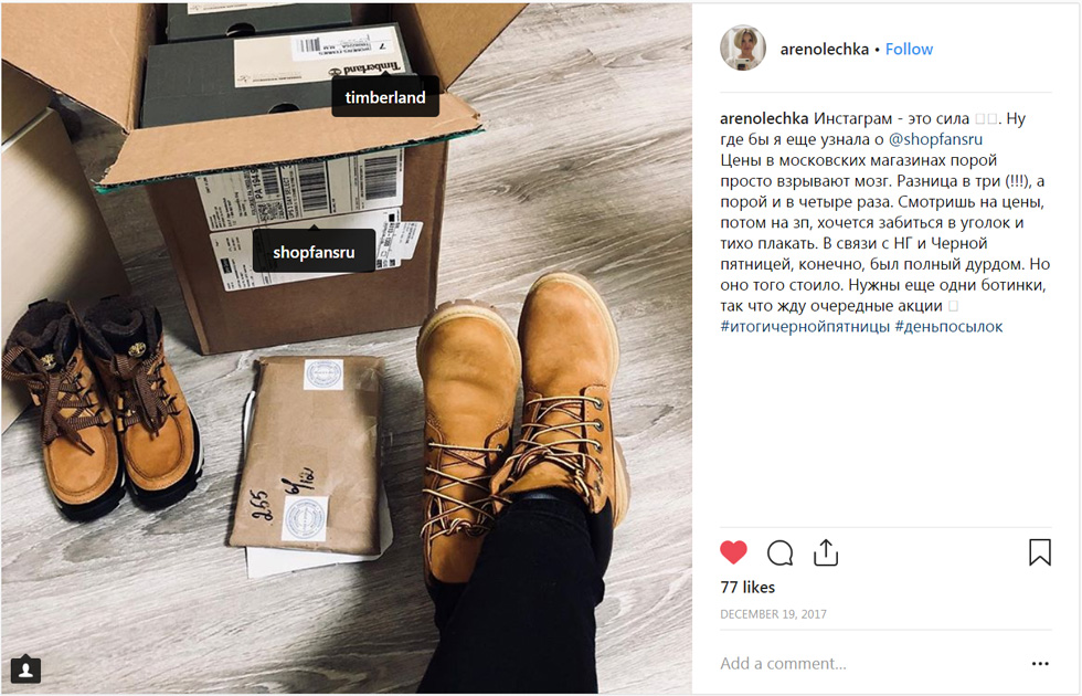 Через 2-3 дня мы получаем вашу покупку, сообщаем вам что все в порядке и отправляем посылку в составе нашей регулярной партии рейсом Аэрофлота в Россию. Вот и всё. Потратив 30 минут времени вы покупаете оригинальную пару ботинок в США за 7-10 тыс. рублей вместо 20-25 тыс. в России.